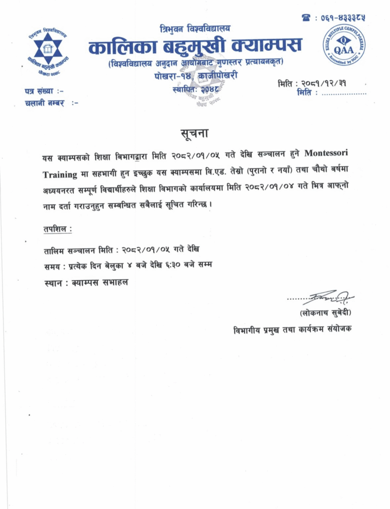 स्नातक तह दोश्रो वर्षके कक्षा संचालन सम्वन्धमा | सूचना तिज गित प्रतियोगिता समय सम्वन्धमा | सूचना स्नातक तह दोश्रो वर्षको नियमित परीक्षा फाराम भर्ने वारे | सूचना छात्रवृत्ति सम्वन्धमा | सूचना तिज गित प्रतियोगिता सम्वन्धमा | सूचना स्नाकोत्तर तह दोश्रो सेमेष्टरको कक्षा संचालन सम्वन्धमा